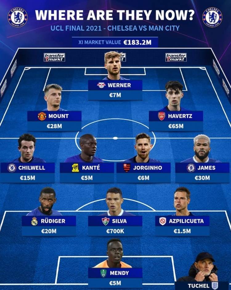 德转列切尔西2021欧冠决赛首发:哈弗茨当前身价最高 2人还在阵中